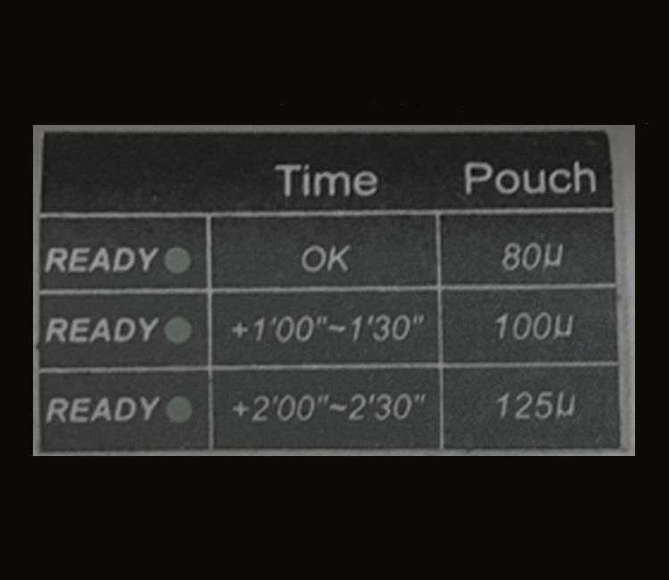 3. Volg het tijdschema voor opwarmen afhankelijk van de dikte van het document en de folie.(zie tabel rechts boven op het toestel en op de foto