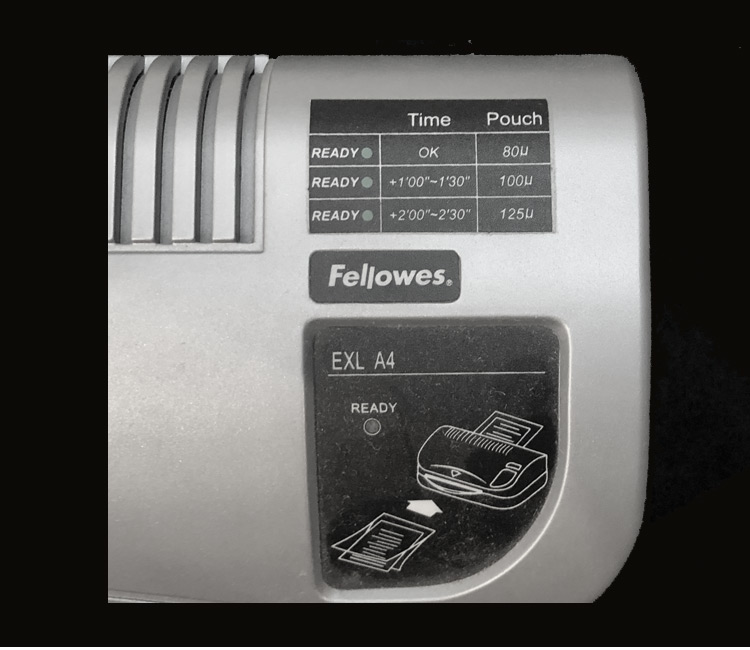3. Volg het tijdschema voor opwarmen afhankelijk van de dikte van het document en de folie.(zie tabel rechts boven op het toestel en op de foto